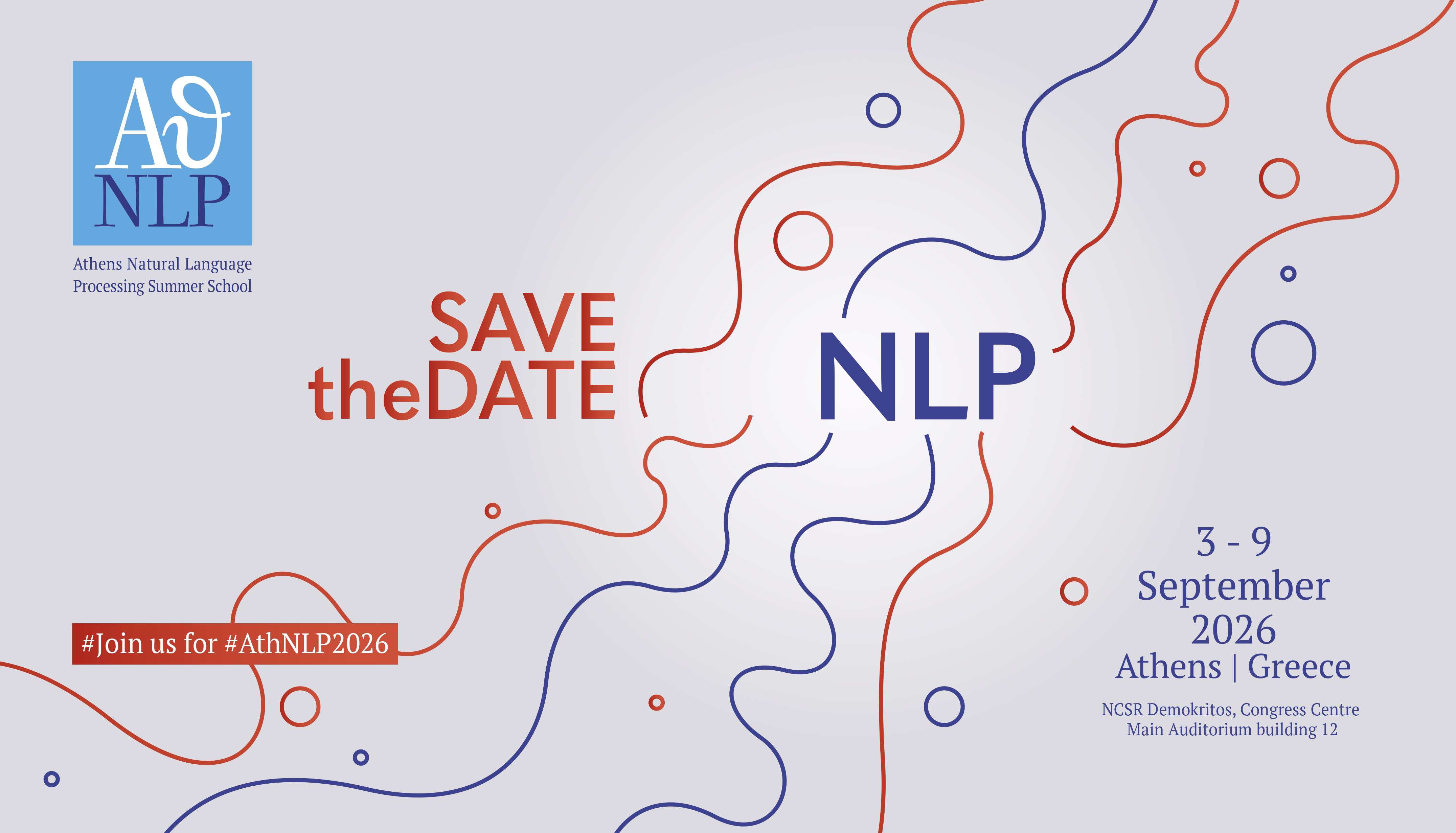Athens Natural Language Processing Summer School (AthNLP) 2026 will take place on September 3rd-9th at the campus of NCSR “Demokritos” in Athens, Greece. Details will be announced in the next weeks. The summer school is organized jointly by RC “Athena”, NCSR “Demokritos”, Athens University of Economics and Business (Department of Informatics), and Heriot-Watt University.
